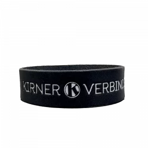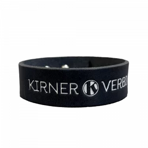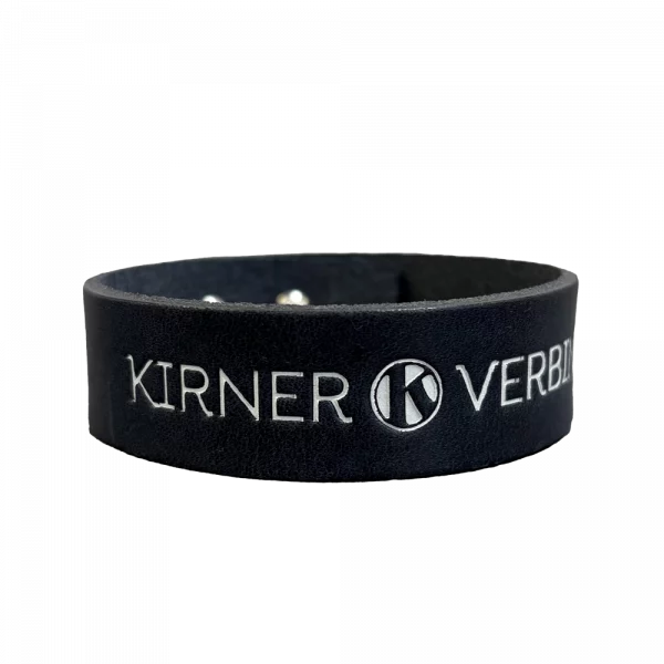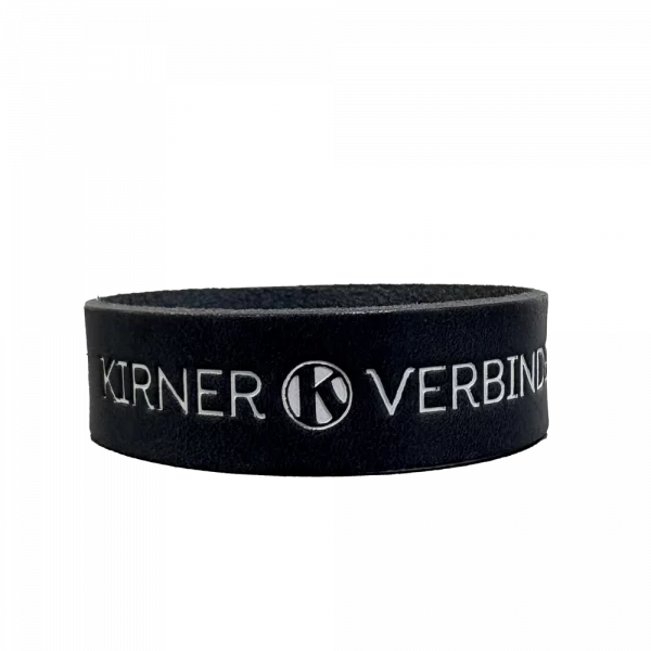 Der eingeprägte Schriftzug „KIRNER VERBINDET“ setzt ein klares Statement, während zwei silberfarbene Nieten eine individuelle Größenanpassung ermöglichen.